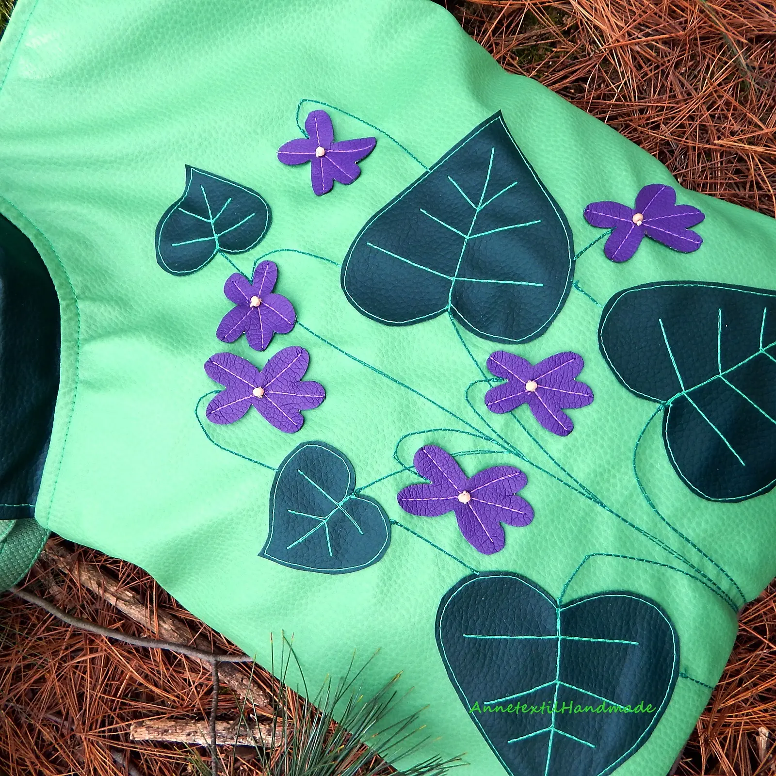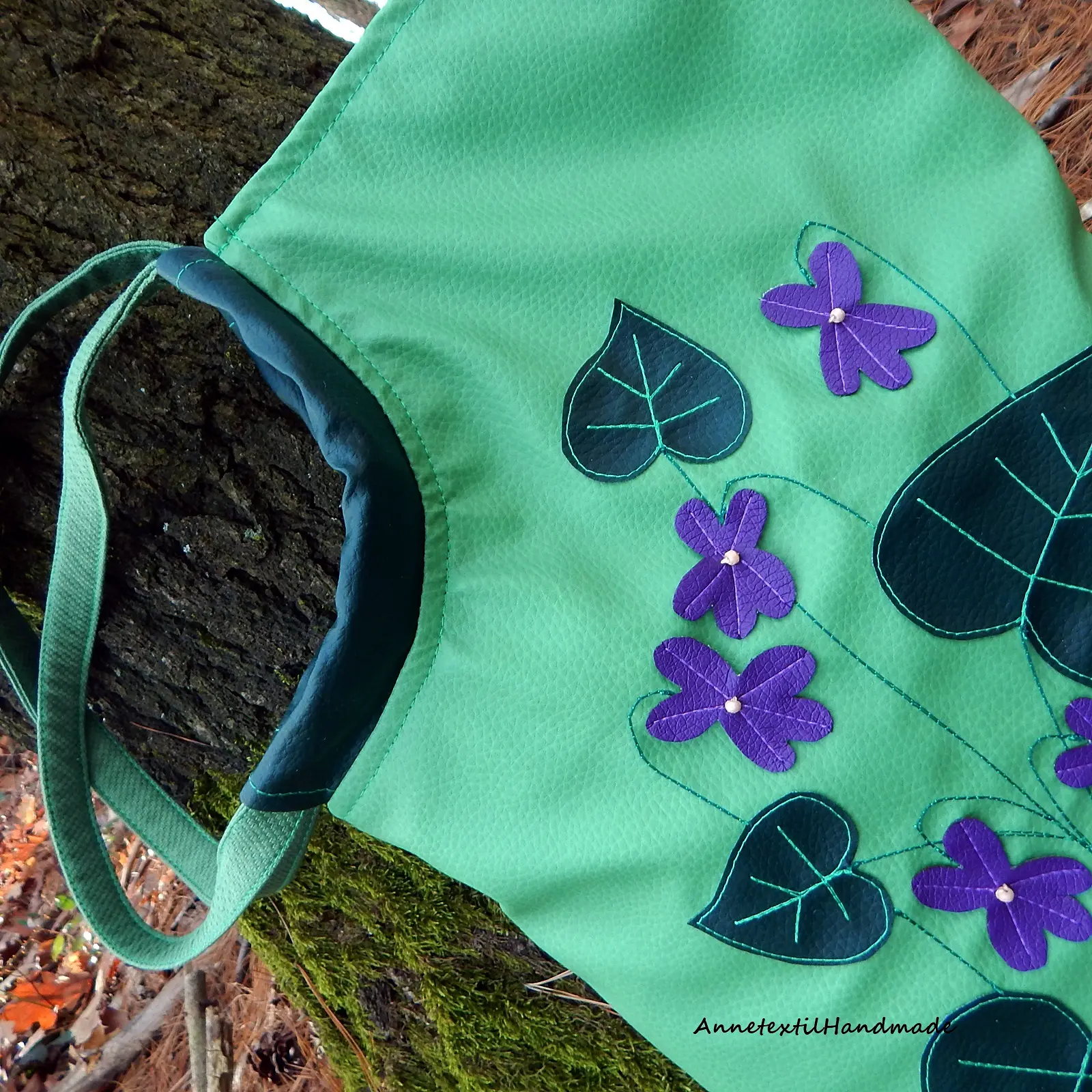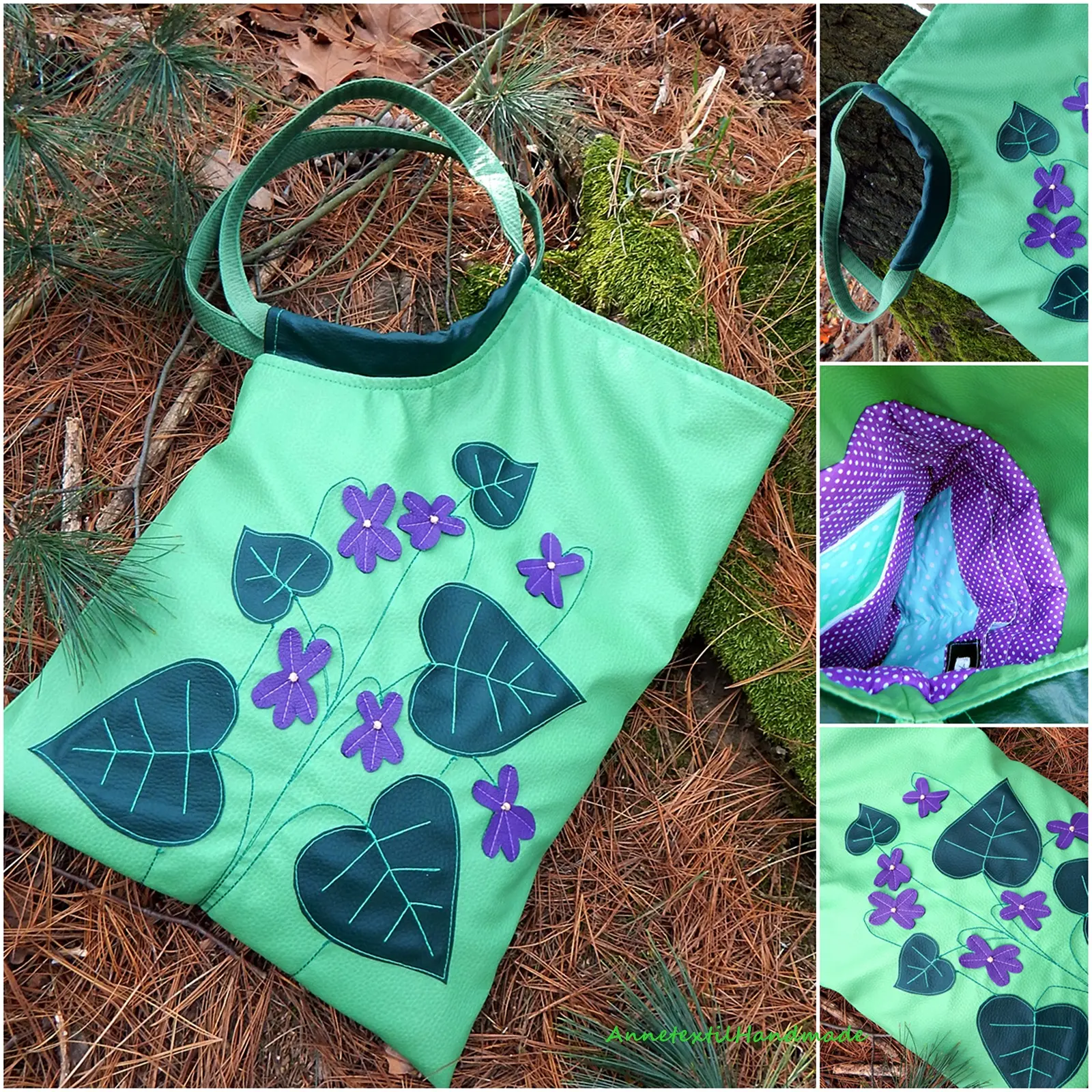 Egyedi, különleges világoszöld, sötétzöld és lila, puha textilbőrből készült táska ibolyákkal - ha igazán különleges táskára vágysz :)