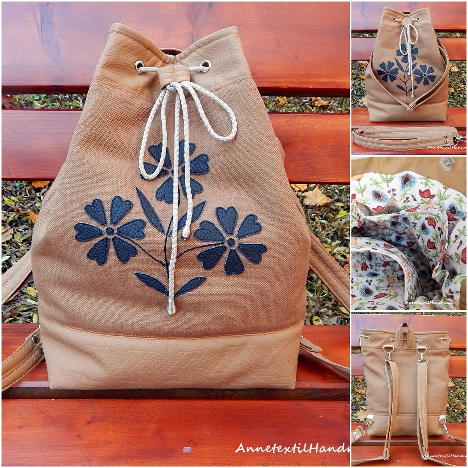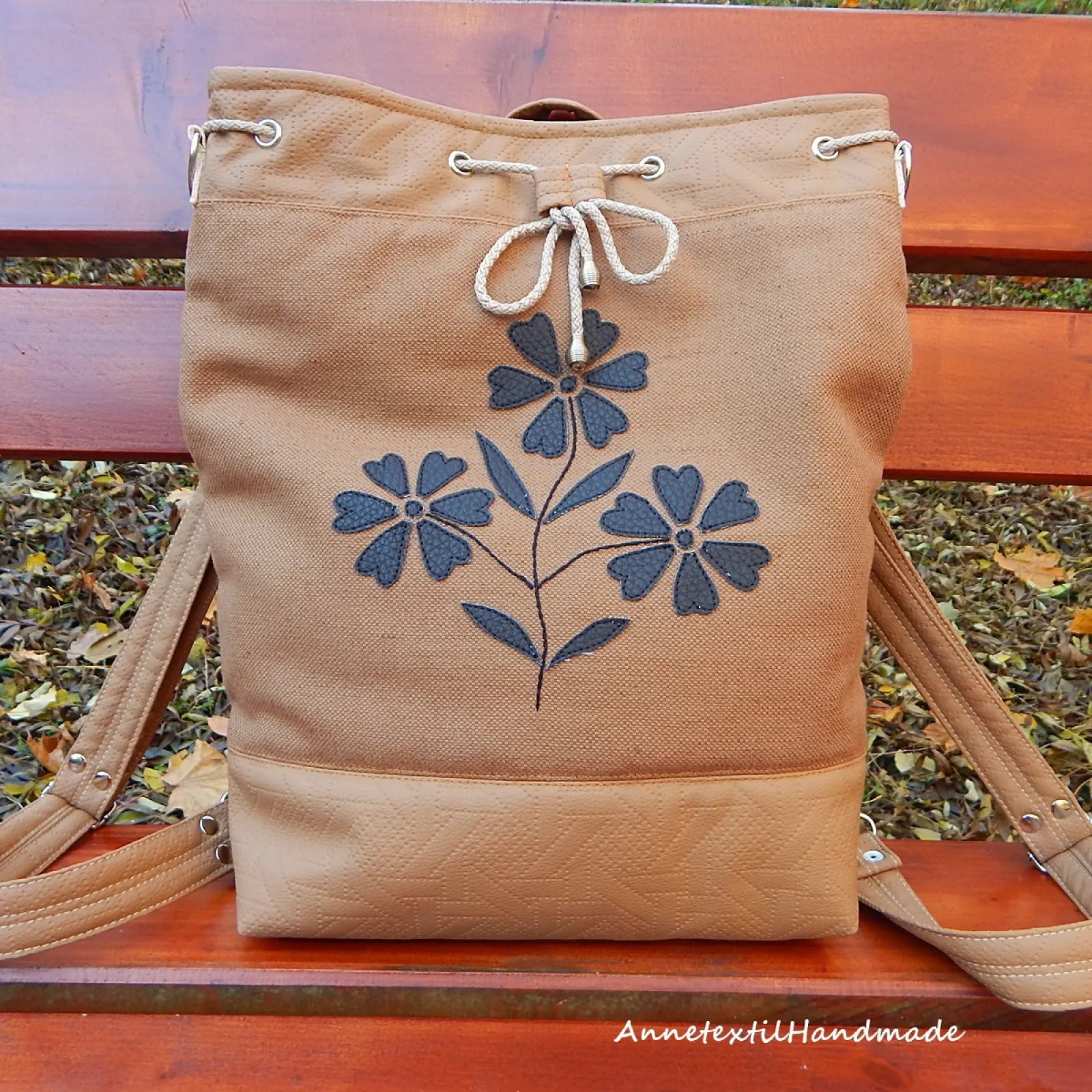 Ezt a modellt magyar népi, kalocsai virágos motívummal készítettem, melyet textilbőrökből varrtam fel a táska elejére, majd a szárakat kézzel hímeztem. Hagyományőrző stílusával bármely korosztály számára egyedi ajándék lehet.