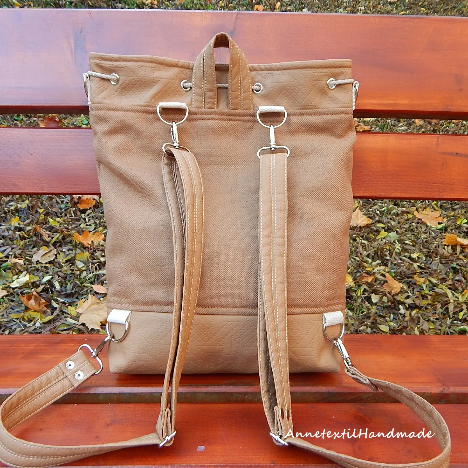 A fotókon látható modell 3 az 1-ben többfunkciós táska, mely a pántok megfelelő helyre csatolásával viselhető hátizsákként, vagy válltáskaként, vagy testen keresztben átvetve.