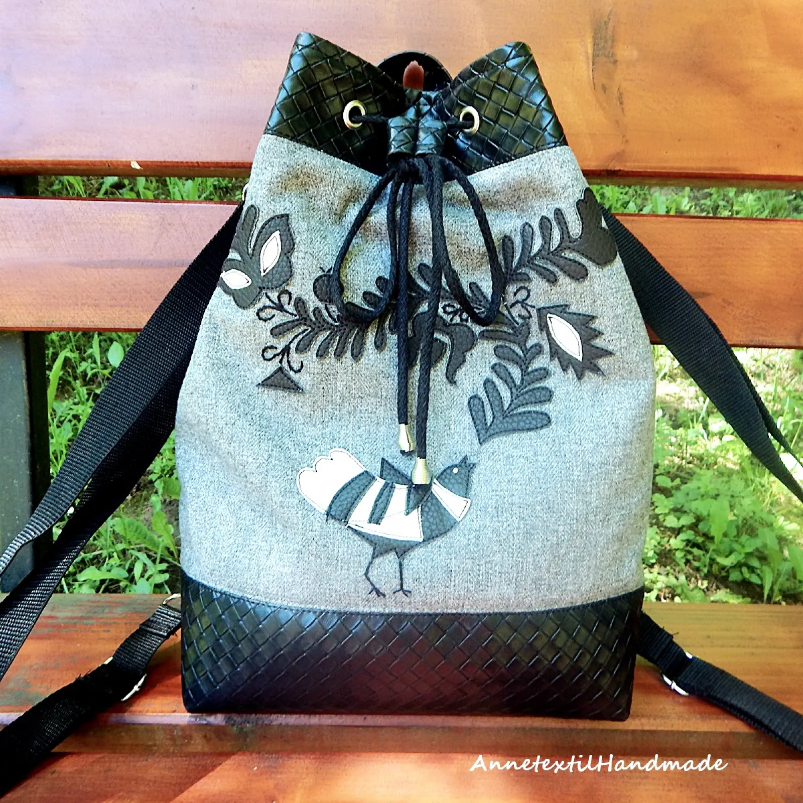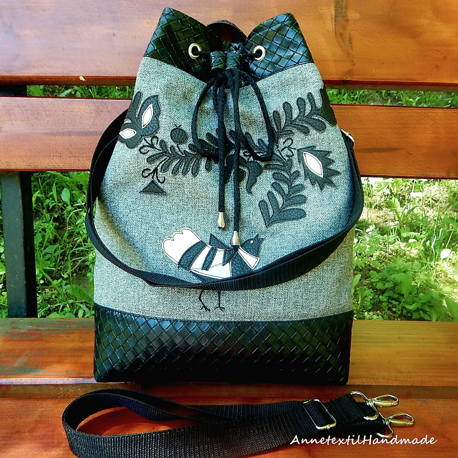 Magyar népmesék 2in1 kézműves hátizsák és válltáska - fekete, fehér, szürke Upcycled