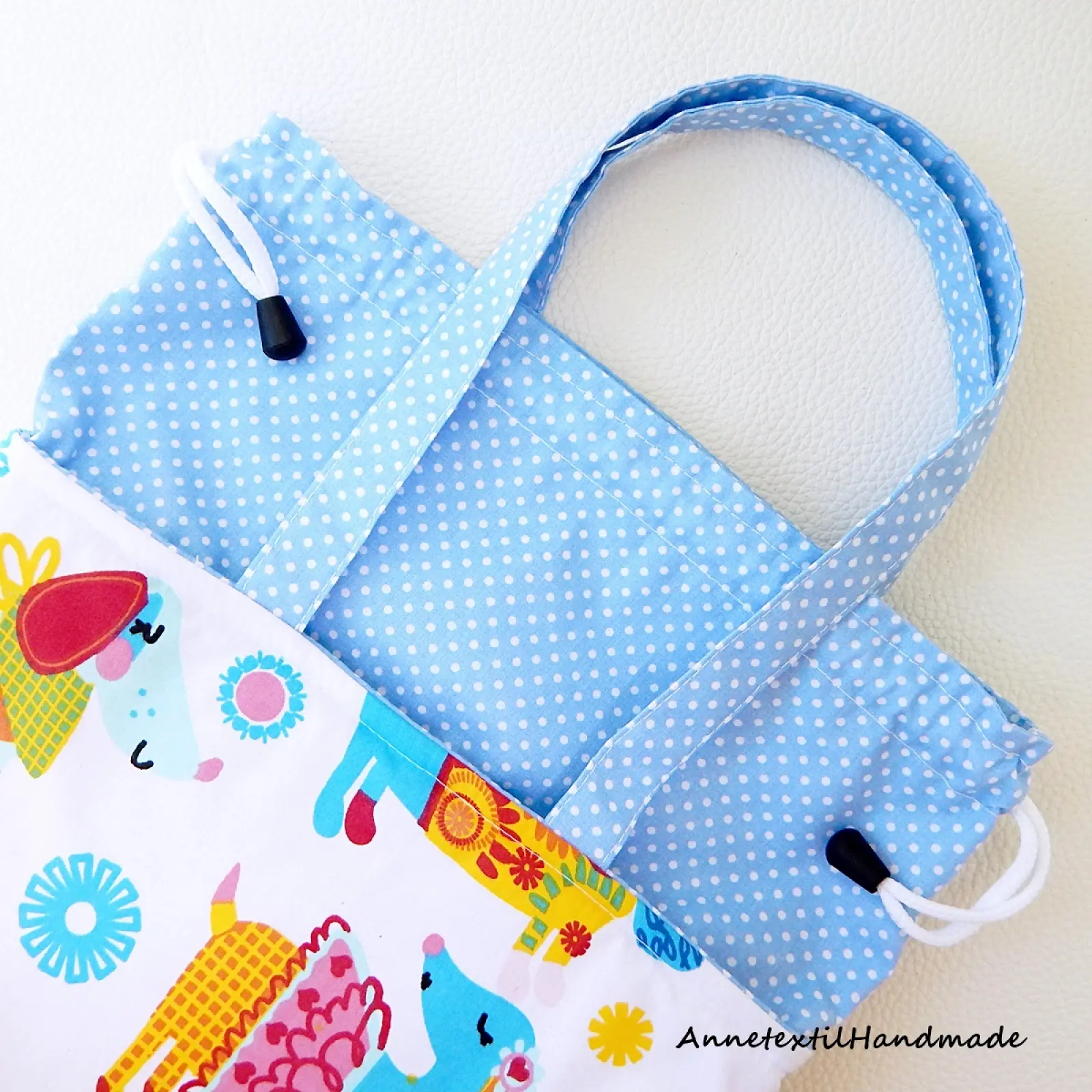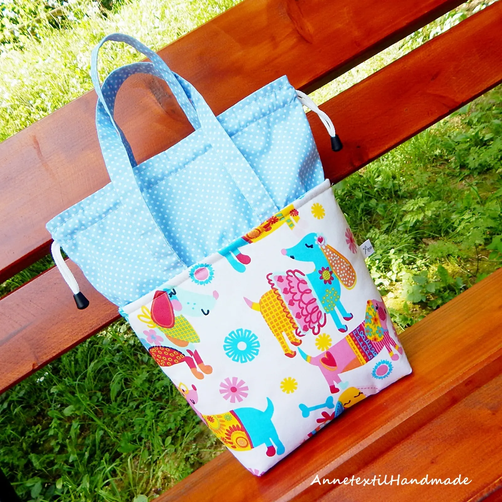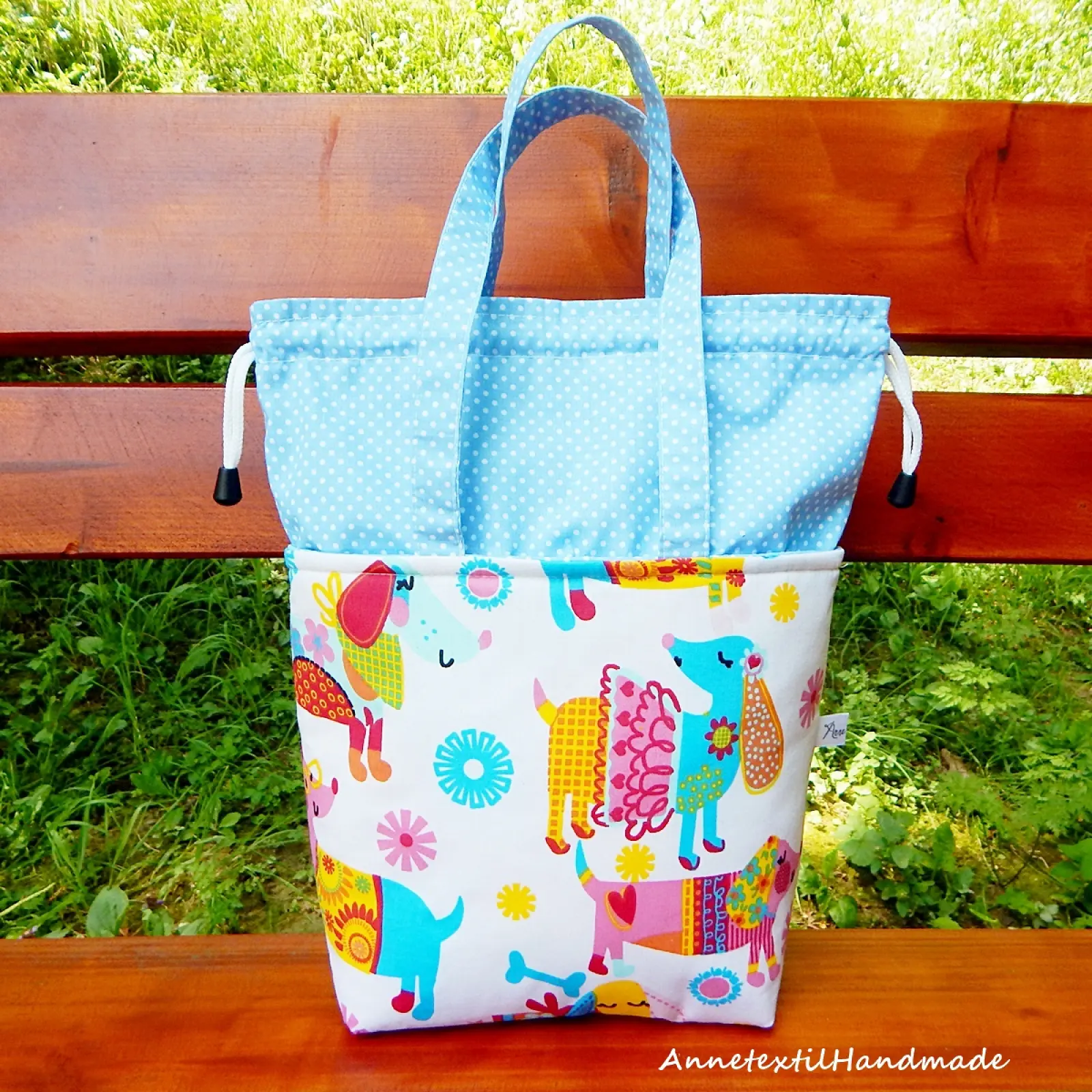 Ebben az ajánlatban közepes méretű fehér alapon színes ruhás, vidám kutyás és világoskék alapon pöttyös mintás pamutvászonból készült modellt hoztam, melynek bélése vízhatlan, nedves szivaccsal letörölhető PUL béléssel készült, a rétegek között merevítőkkel megerősítettem.
