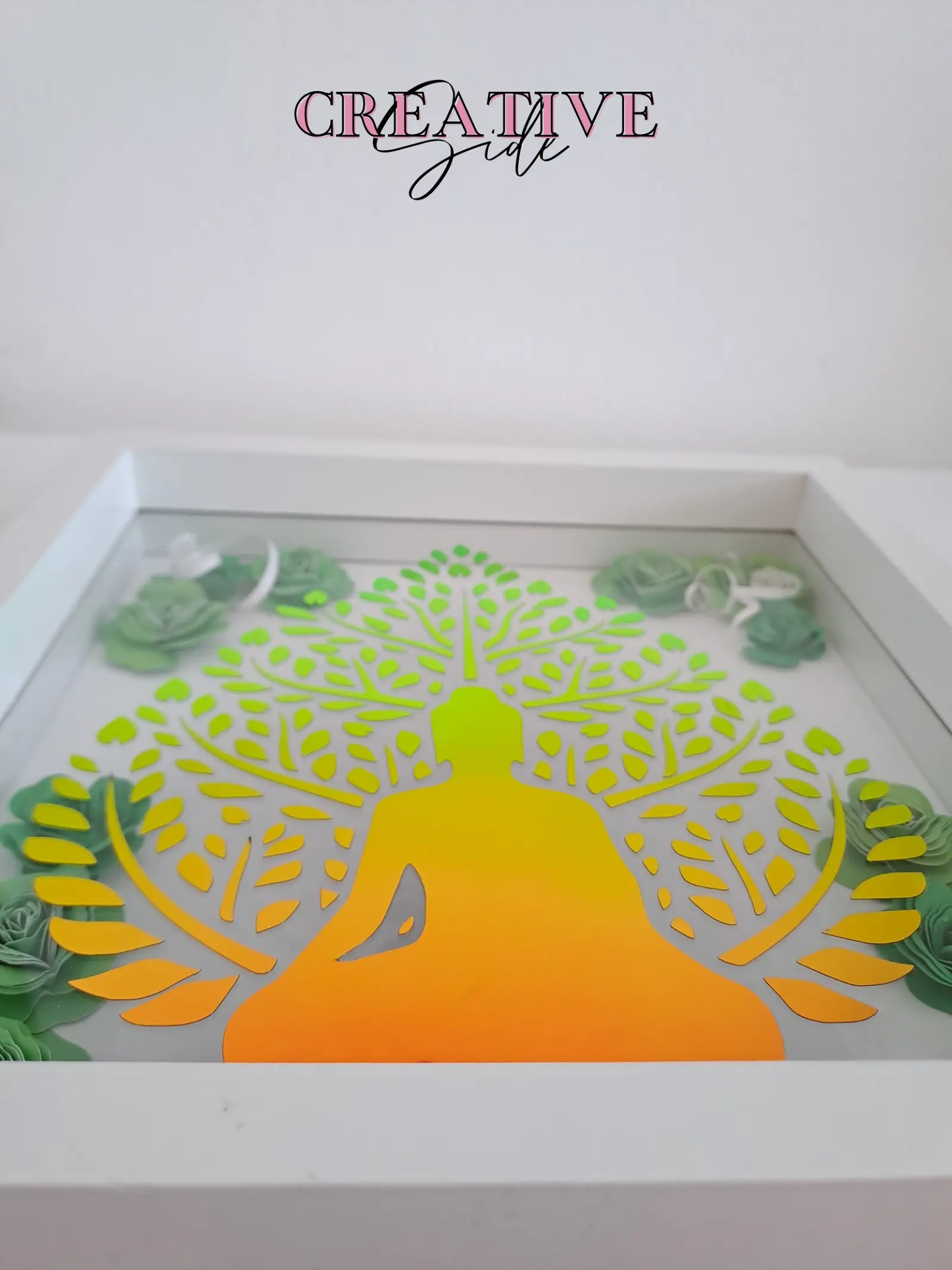Ismerd meg legújabb alkotásomat, egy egyedülálló shadow boxot, amely tökéletesen ötvözi a kézművességet és a modern művészetet! Ez a különleges darab holografikus Buddha sziluettel és életfát ábrázoló elekrtomos géppel vágott díszítéssel készült, amelyet gondosan válogatott zöld árnyalatú 3D papírrózsák egészítenek ki.