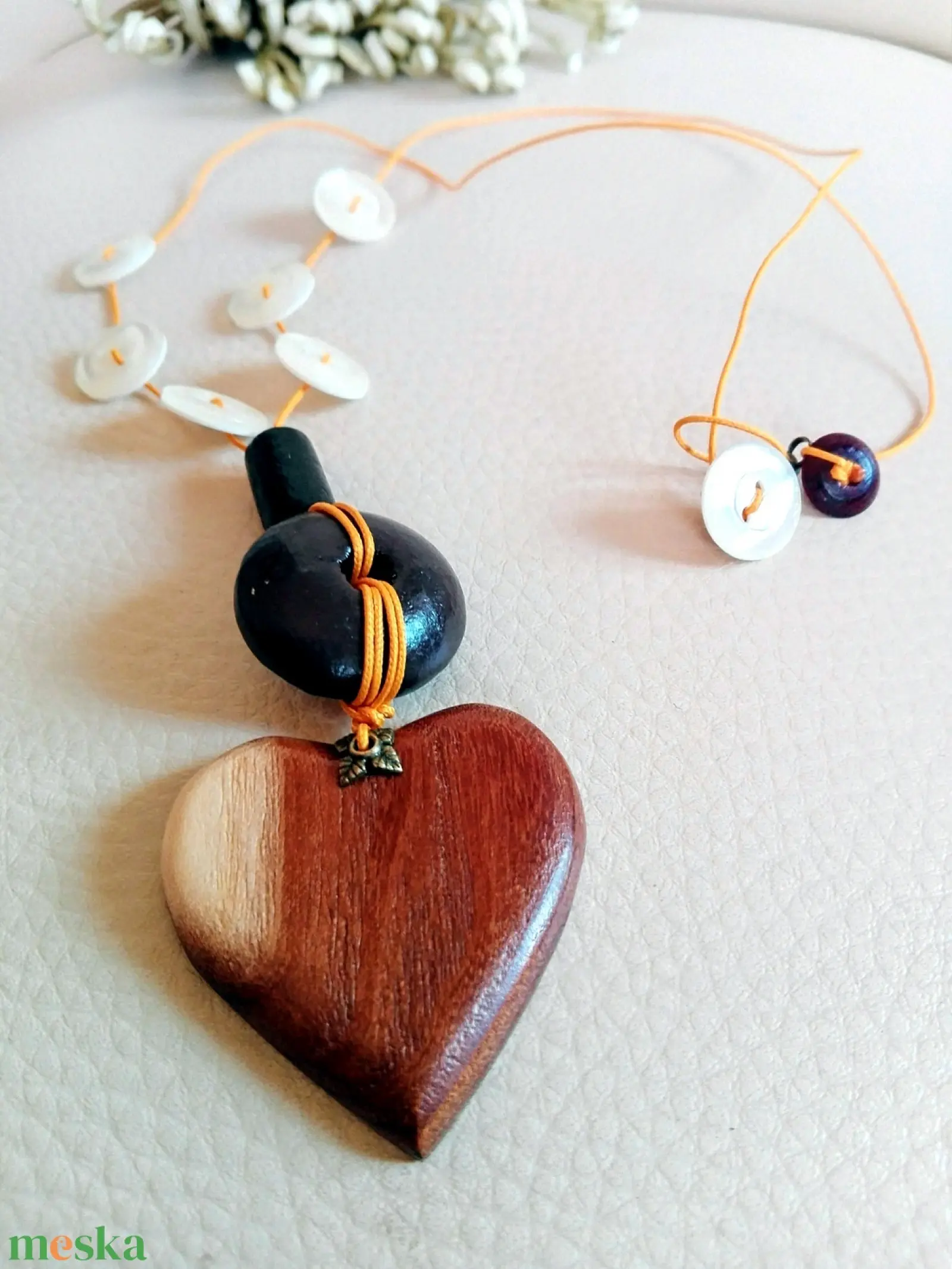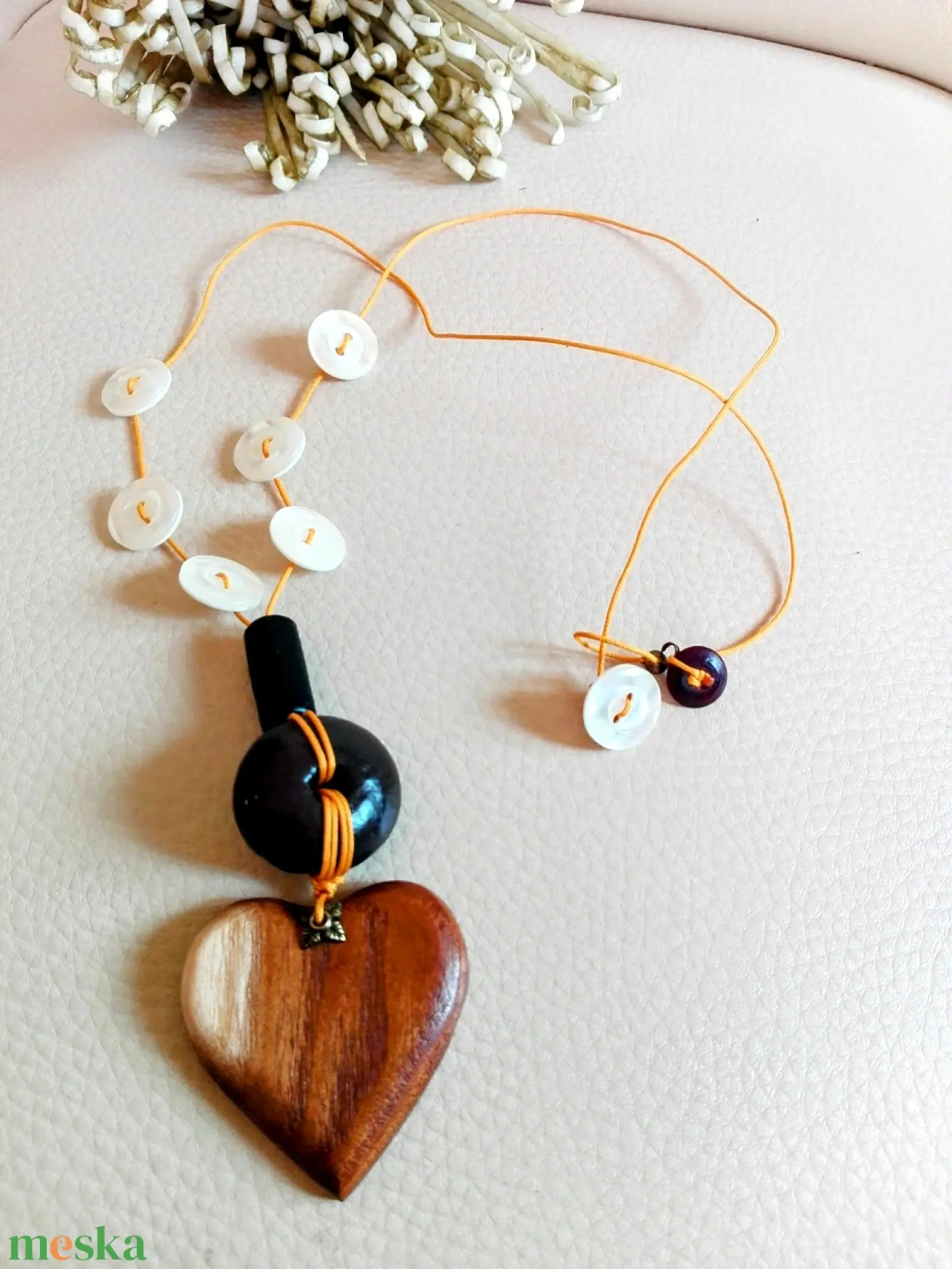 Fa medál és gyöngyök adják az alapját szíves nyakláncomnak . A kagylóhéj gombokkal bohém stílusú ékszerré formálódott. A kapocs hurkolással rögzül, egy kagyló gomb és fa gyöngy fokozza bohósagát. Viaszolt zsinór szálon fut a kompozíció.