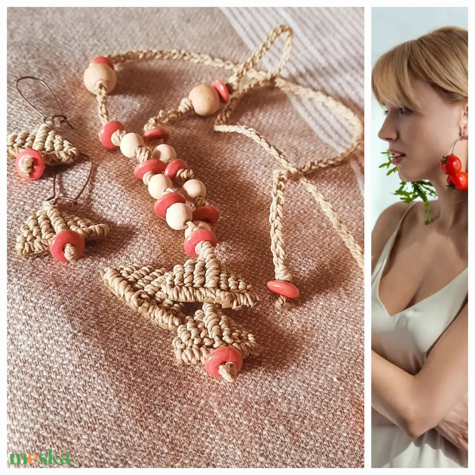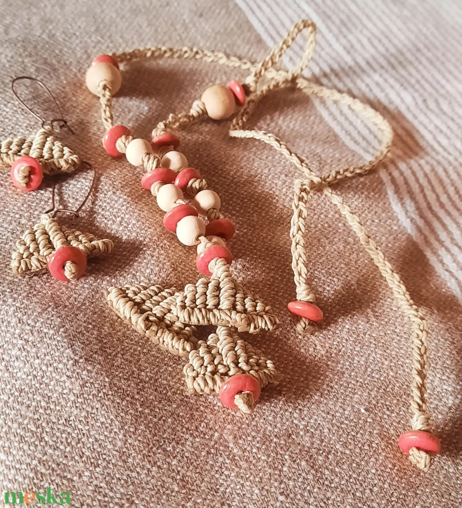 Natúr, gyékényszínű zsinórból csomóztam a nyakláncot és a fülbevalót. Natúrszínű fa gyöngyök és halvány lazac színű gyöngyök díszítik. A fülbevaló akasztós, bronz alapra készült. A fülhorog kérésre változtatható.