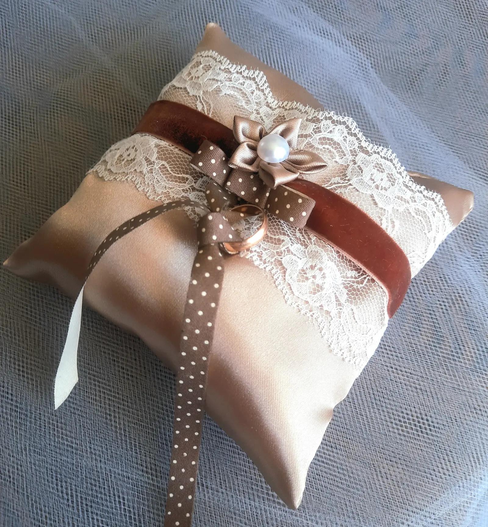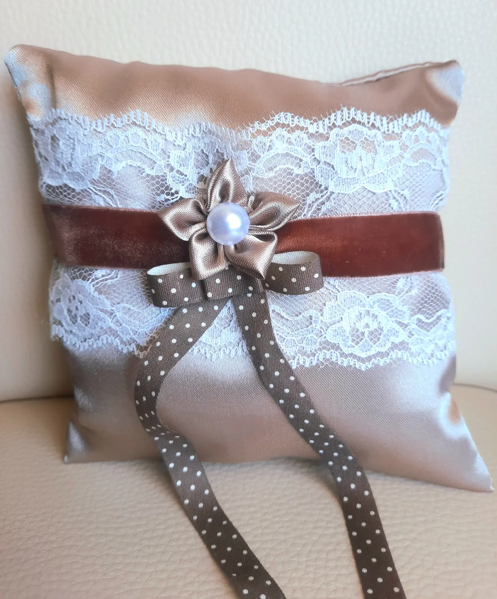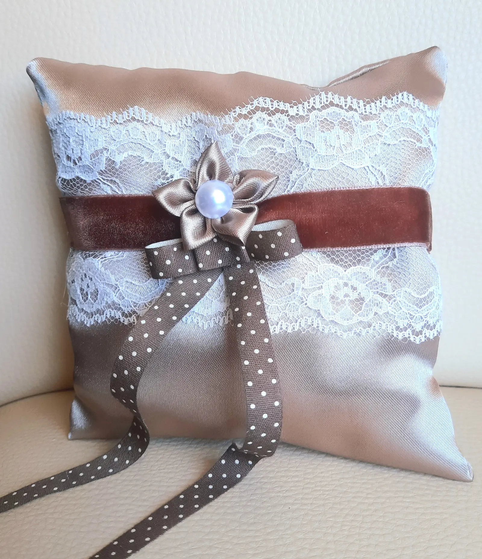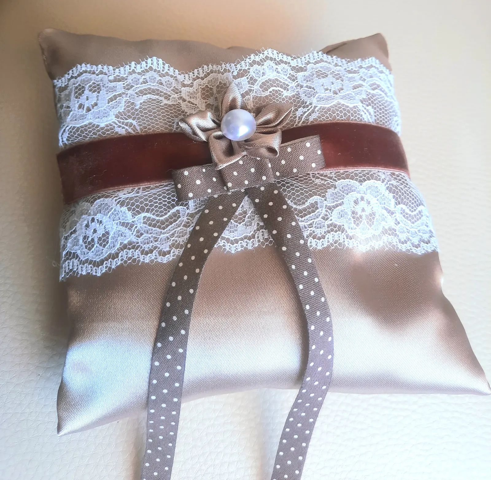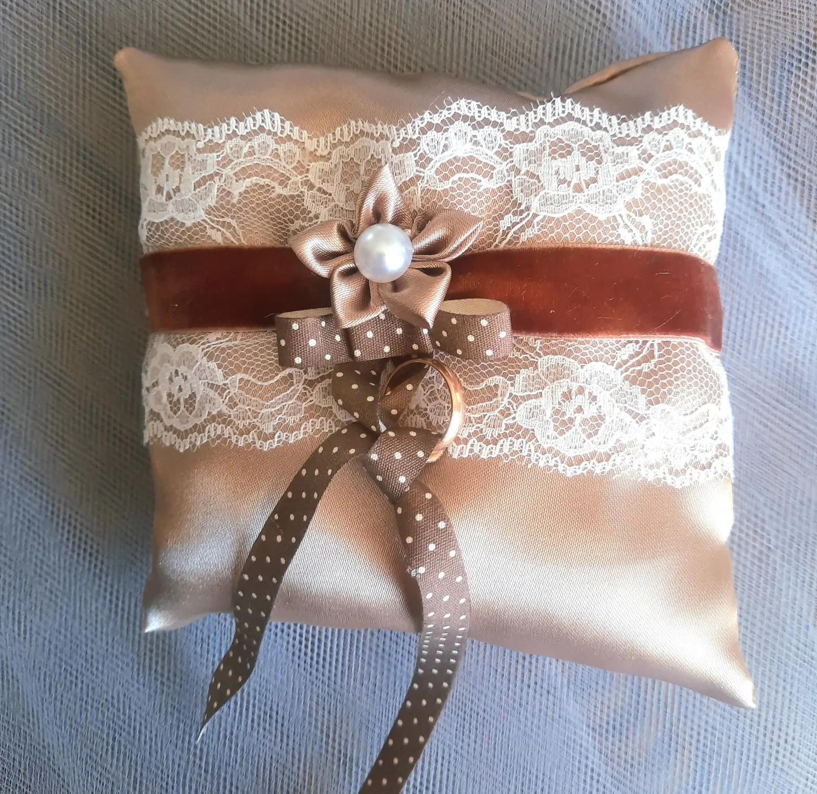 Mogyoróbarna, fényes szatén párna, csipke és bársonyszalag díszítéssel. A barna pöttyös lenvászon kötöző tartja a gyűrűket. Puha , kellemes tapintás. Esküvődön elegáns megjelést ad a gyűrű átadásakor.