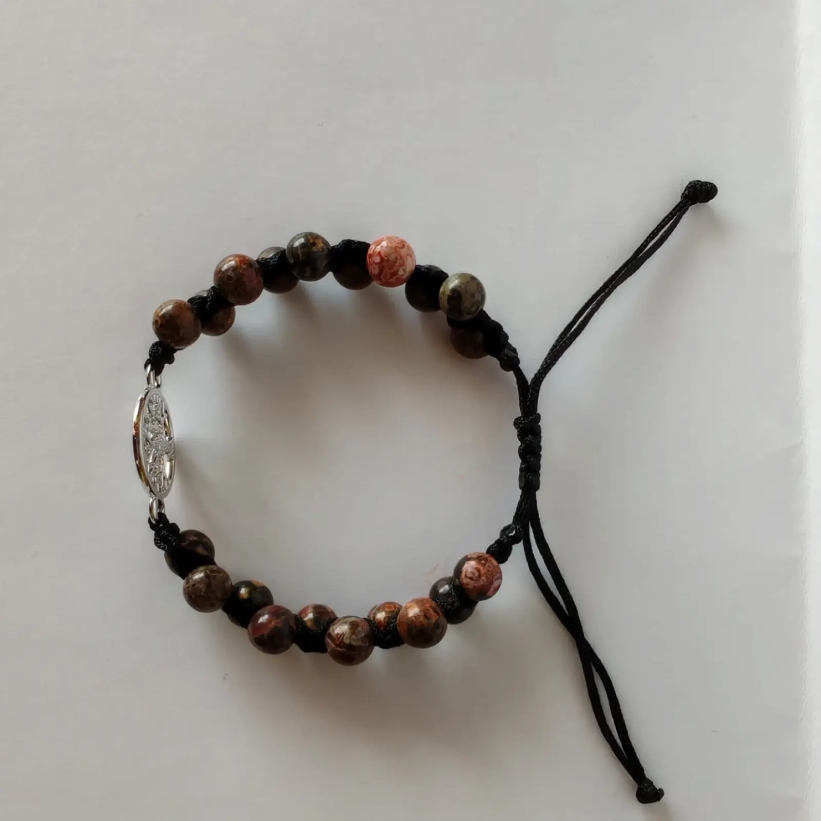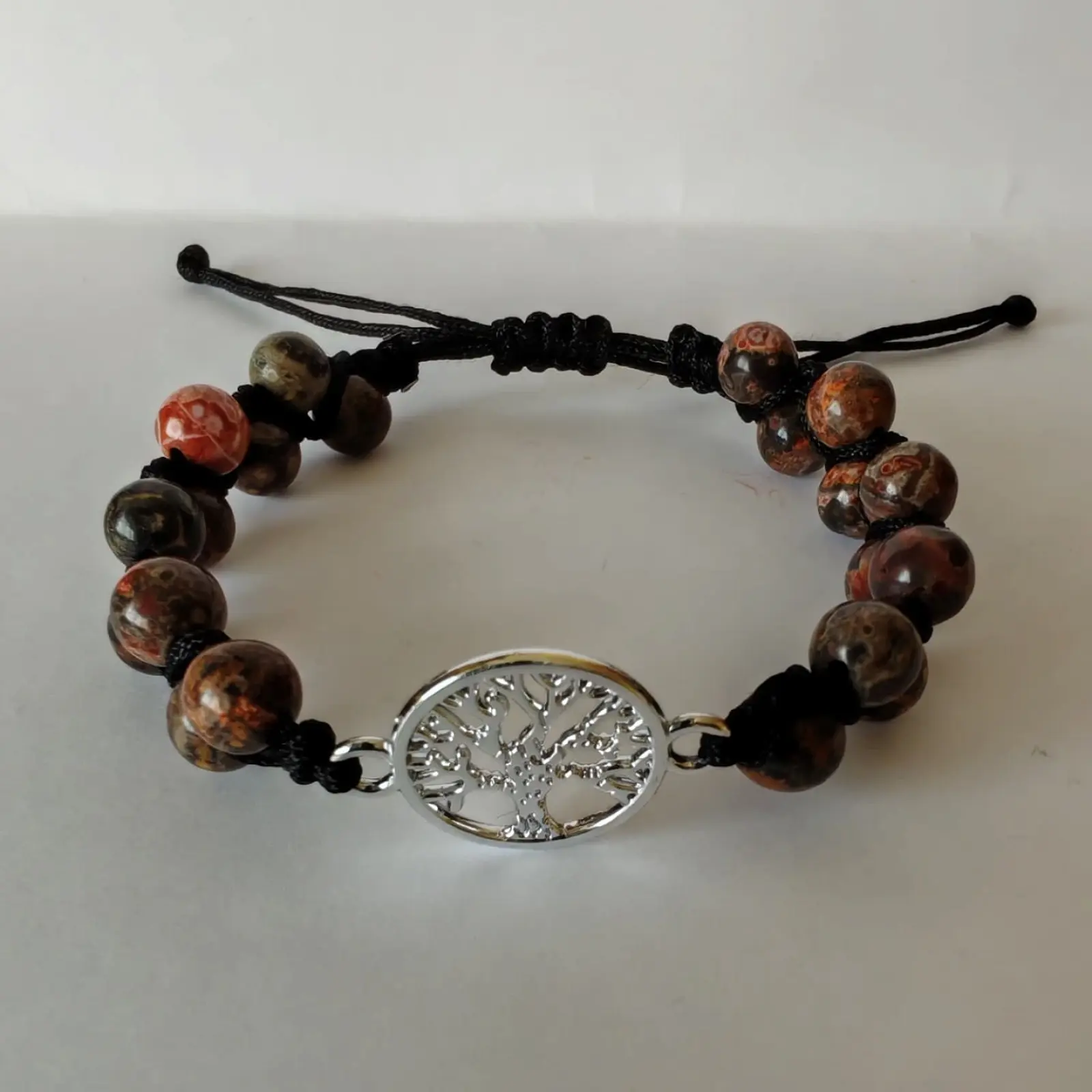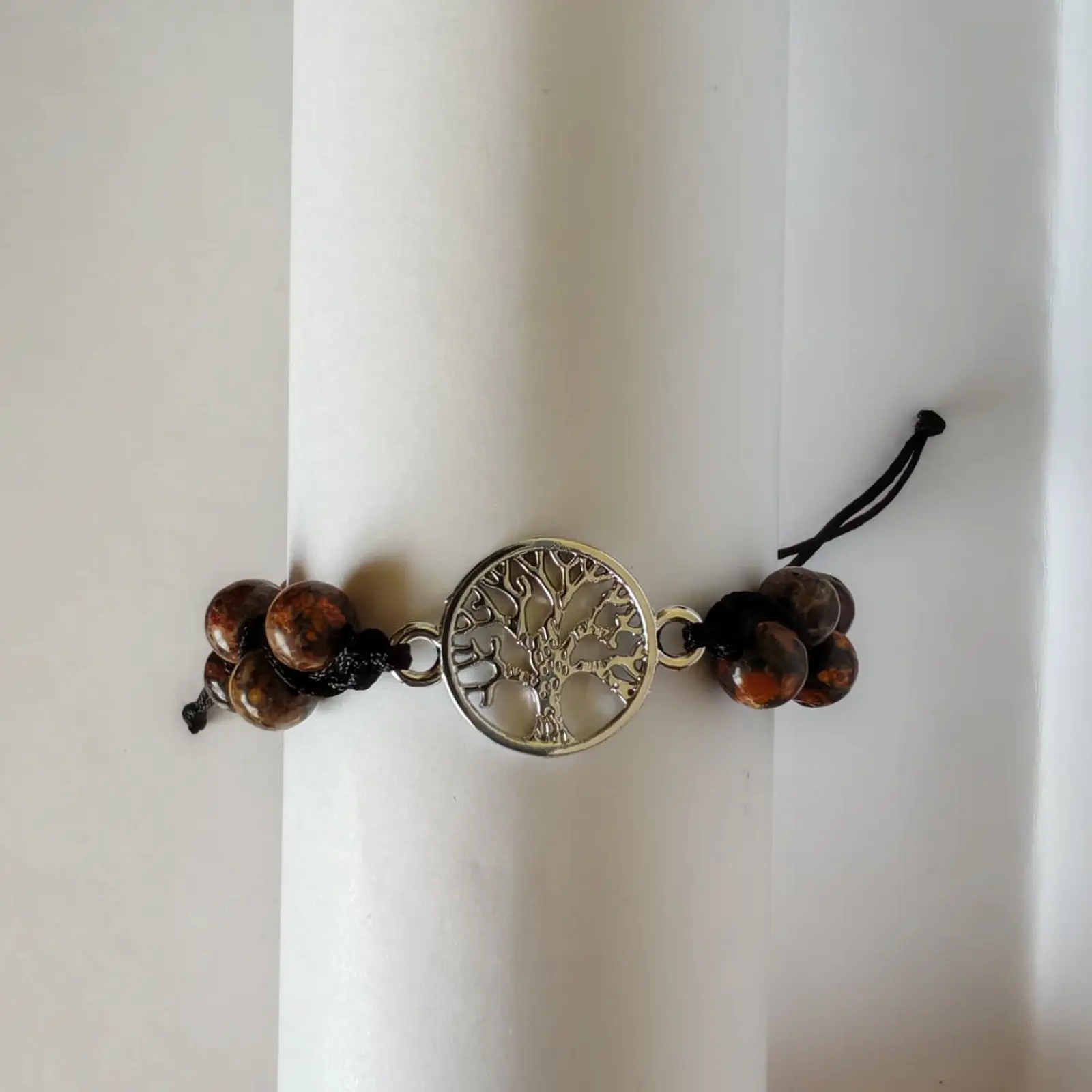 A szemek átmérője 6mm, fekete nejlon zsinórral csomózva, ezüst színű Életfa összekötő medállal. Csúszka csomó lehetővé teszi, hogy minden csuklóméretben jó legyen (min 16cm csukló mérettől).