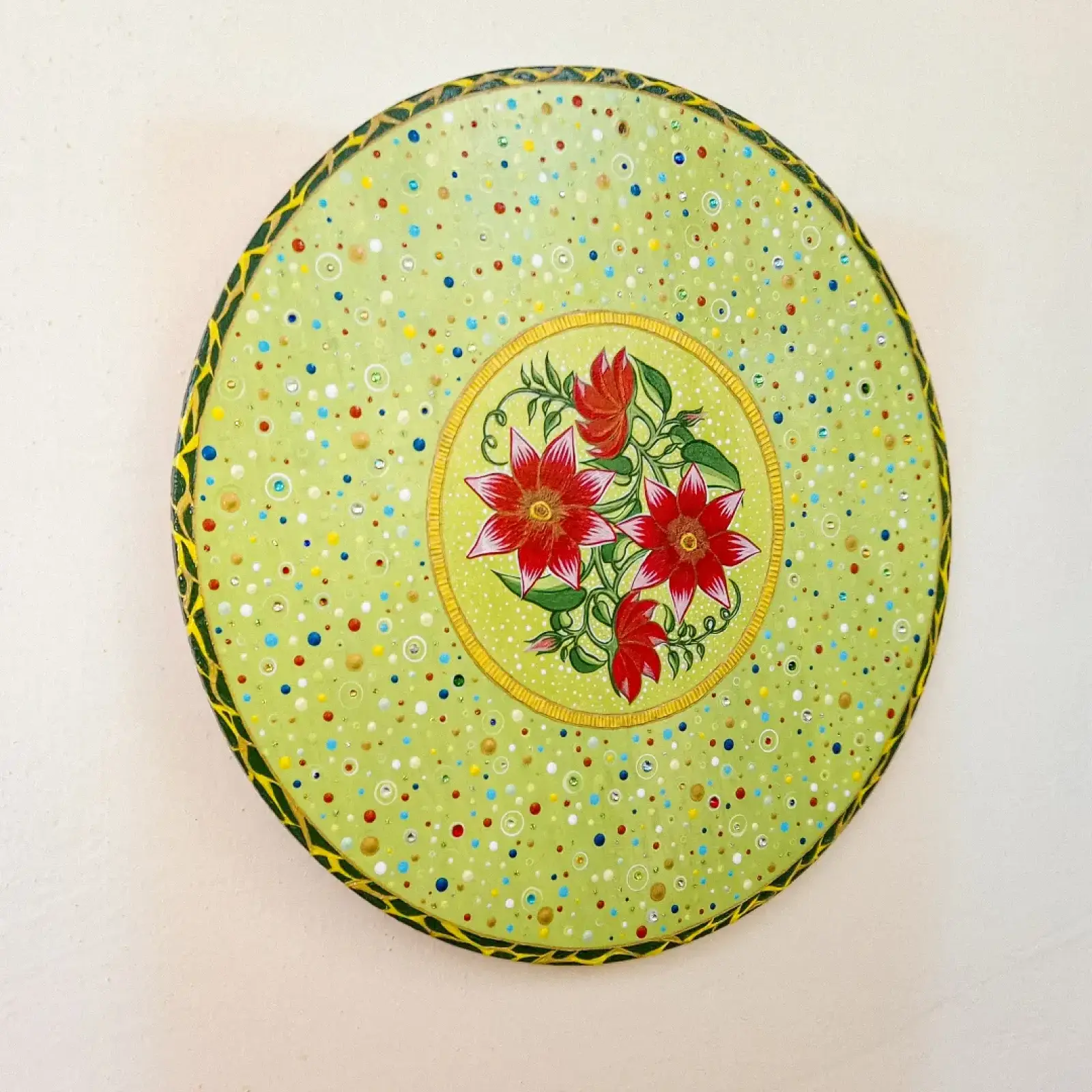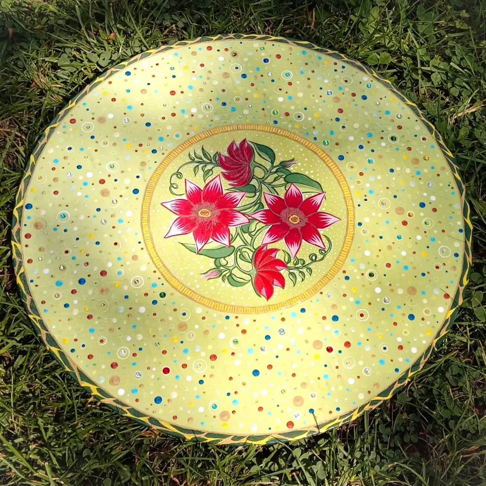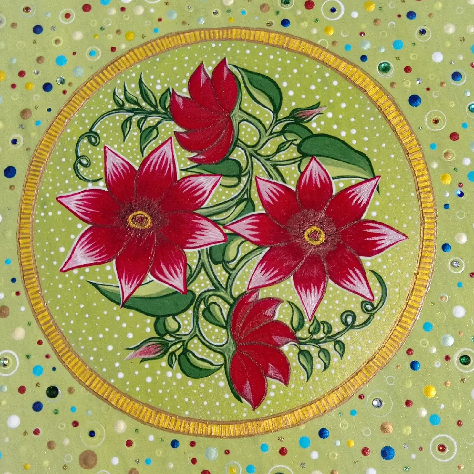 Ehhez a munkámhoz a jáde kő adta az inspirációt vagyis a háttér színét a jáde kő egyik színe után kevertem ki. A virágok kézzel rajzoltak és festettek, ahogyan a külső és belső körív is mely egyfajta keretet biztosít a képnek.